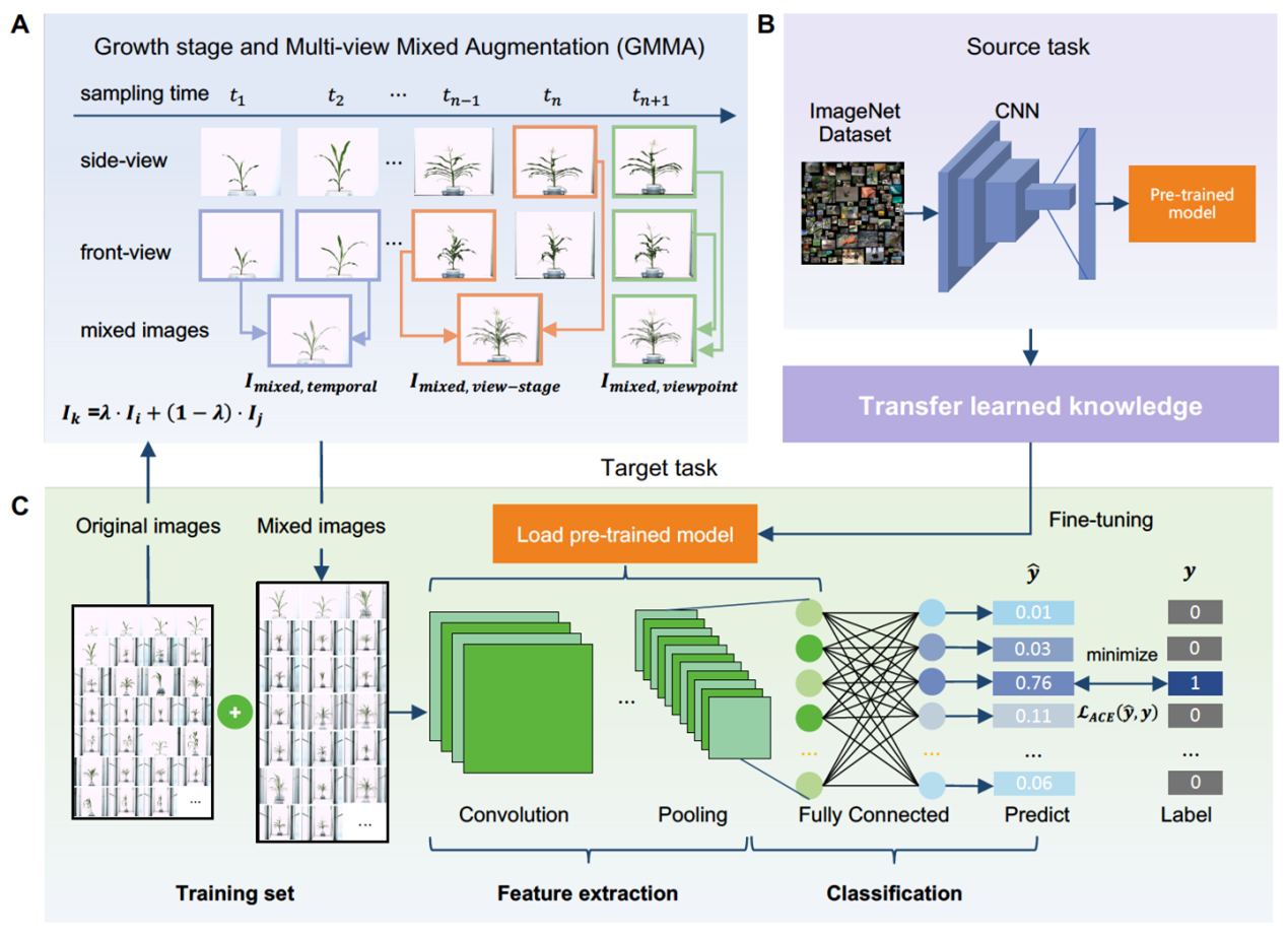 Img2Variety以整株作物RGB图像为输入,采用迁移学习策略,对多种经典卷积神经网络模型进行全参数微调训练,以适应品种数量多而单个品种样本有限的植物图像数据特点。针对作物在不同生长阶段和拍摄视角下表型差异较大的问题,本研究提出了生长阶段与多视角混合增强策略,在保持品种标签一致性的前提下扩展训练数据分布。同时,引入自适应交叉熵损失函数,提高模型对易混淆样本的关注度,从而改善品种间的区分效果。研究在两个作物数据集上对Img2Variety进行了验证,包括覆盖全生育期的93个水稻品种共11,170张图像,以及涵盖9个生长阶段的224个玉米自交系共5,599张图像。实验结果显示,Img2Variety在水稻和玉米数据集上的最高识别准确率分别达到88.66%和79.95%,并在部分早期生长阶段(水稻抽穗前、玉米十叶期)取得了80%以上的识别准确率。在此基础上,该方法在六个基准网络上均表现出一致的性能提升,在水稻和玉米数据集上的识别准确率分别平均提升15.09个百分点和34.65个百分点,表明Img2Variety不仅对不同网络结构具有良好的适应性,同时在不同作物类型上也具备稳定的泛化能力。