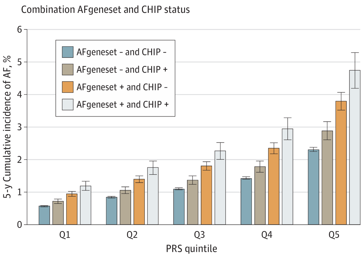 研究发现,PRS、AFgeneset和CHIP均与房颤风险显著相关:PRS高1个标准差时,风险增加65%;携带AFgeneset罕见变异者风险增加63%;携带CHIP变异者风险增加26%。更重要的是,三者之间存在显著的协同效应,在最高风险组中5年发病率可达4.7%,而最低风险组仅为0.6%,相差近8倍。